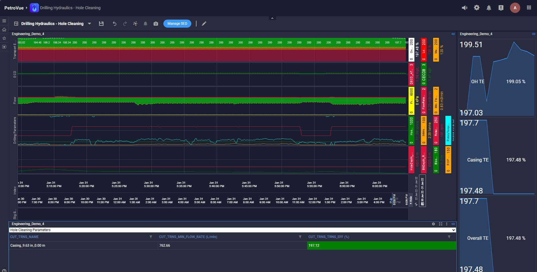 The Hole Cleaning solution addresses the challenge of cuttings accumulation by providing real-time insights into cuttings transport across all well sections. It calculates crucial metrics like slip and transport velocities to determine the minimum flow rates needed for effective cuttings removal and delivers an index representing the hole cleaning status. This prevents stuck pipe, lost circulation, and Non-Productive Time for optimized drilling.