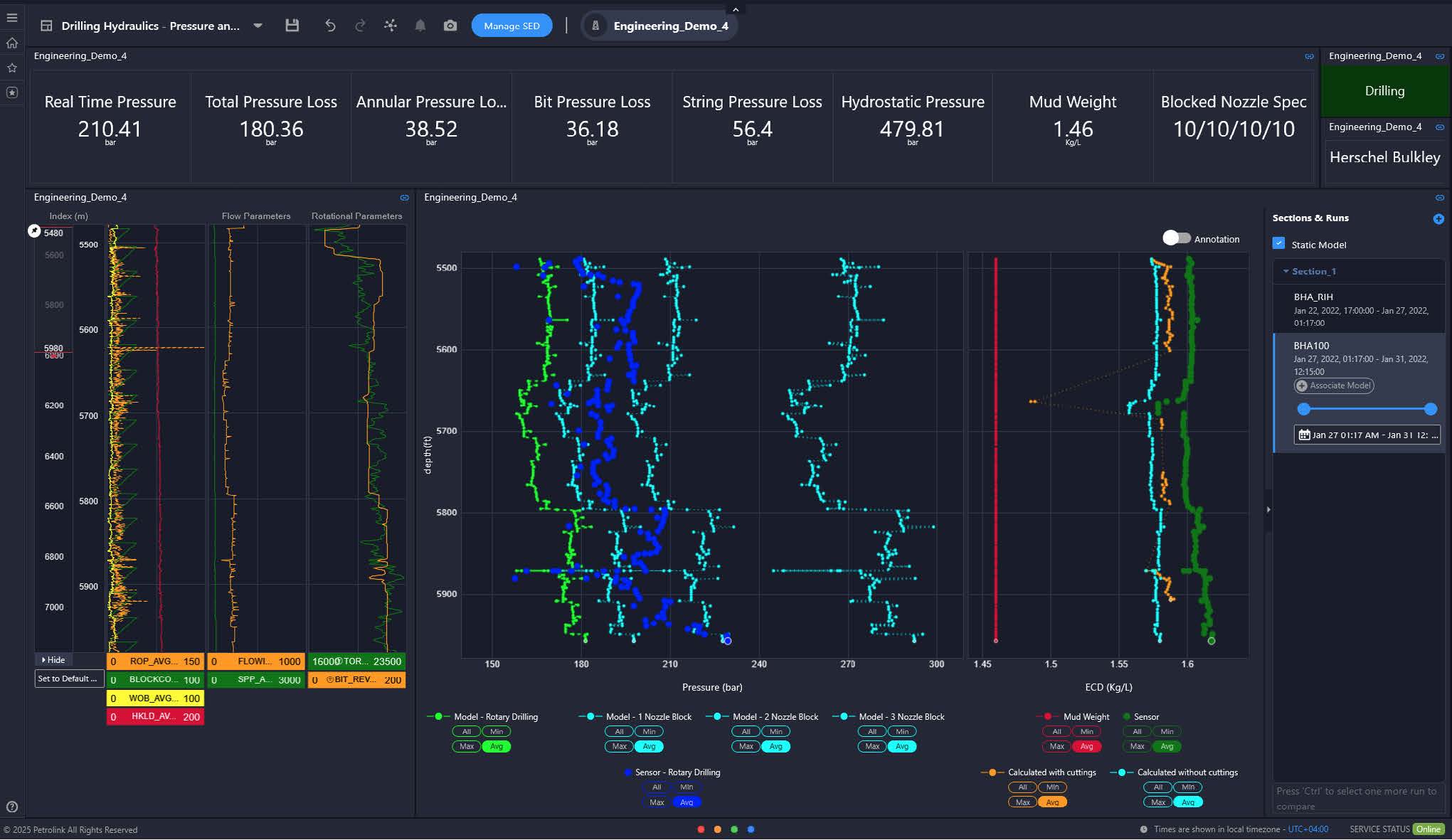 The Hydraulics solution provides a real-time understanding of your wellbore’s circulatory system by delivering insights into critical factors like pressure losses, Equivalent Circulating Density (ECD), cuttings transport, and even modeling the immediate impact of blocked nozzles. This aids in making smarter, data-driven decisions by comparing planned hydraulic models with actual downhole conditions. Consequently, it prevents critical issues such as lost circulation, kicks, and stuck pipe, leading to optimized drilling efficiency, reduced Non-Productive Time, and enhanced operational safety.