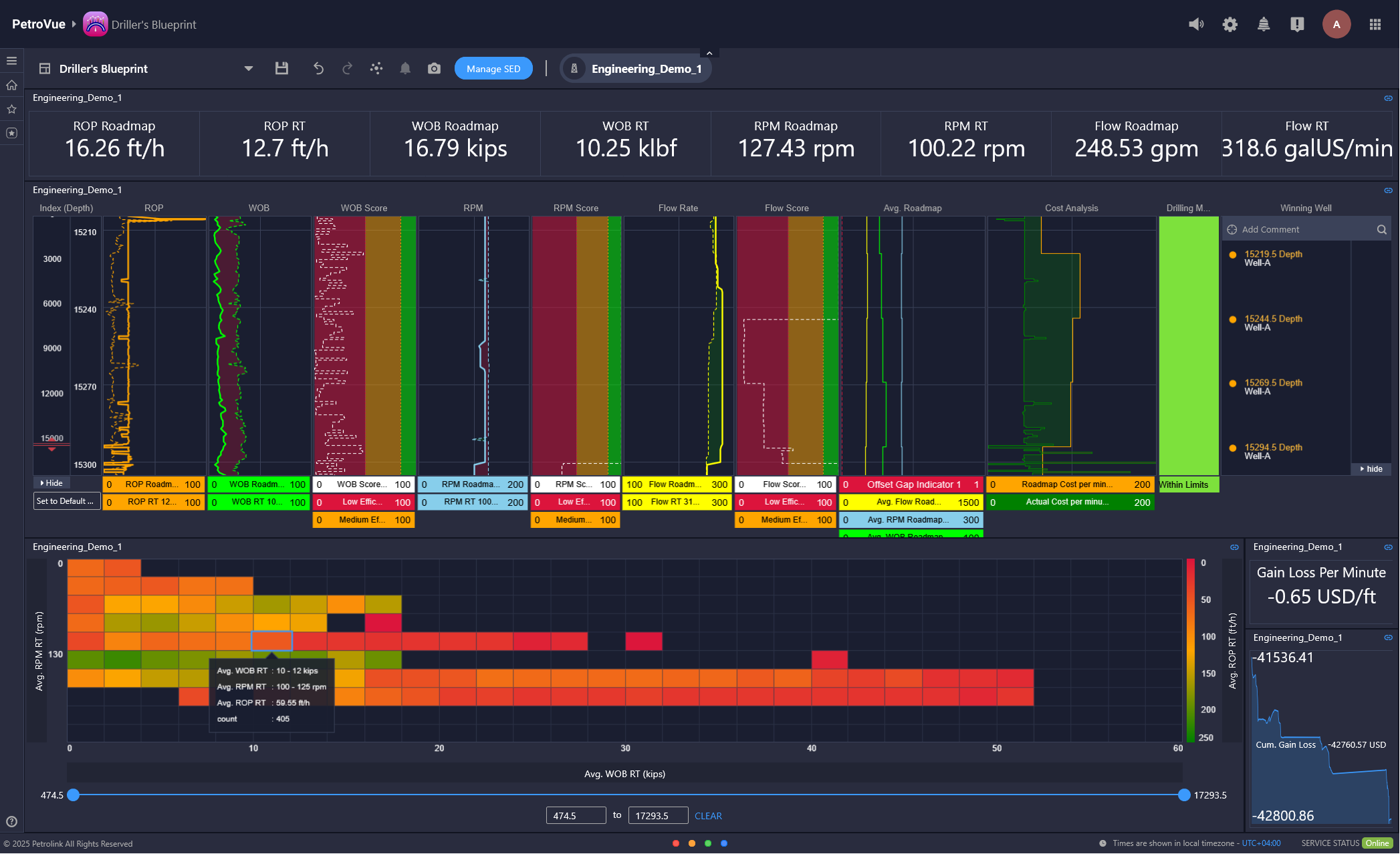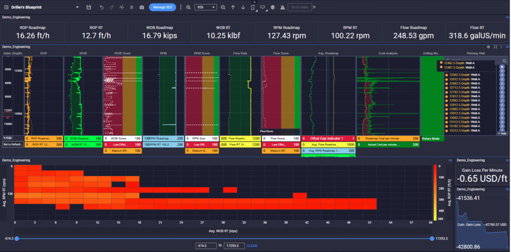 Driller’s Blueprint equips drilling engineers with a data-driven roadmap, analyzing historical offset well data to reveal the ideal drilling parameters (WOB, Flowrate and RPM) that will boost efficiency and speed. This directly translates into significant reductions in drilling costs and valuable rig time. Moreover, the system offers real-time performance monitoring against established benchmarks, providing actionable visual alerts for any deviations, enabling engineers to swiftly course-correct and enhance overall profitability.