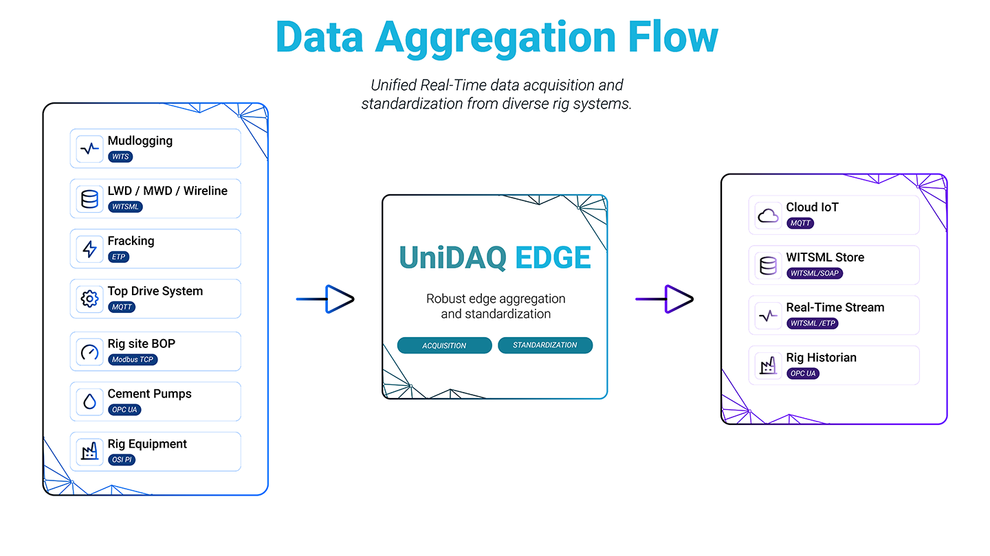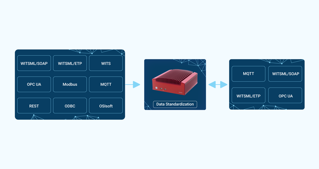 Supports WITSML, OPC UA, Modbus, OSI PI, REST, MQTT, and WITS.