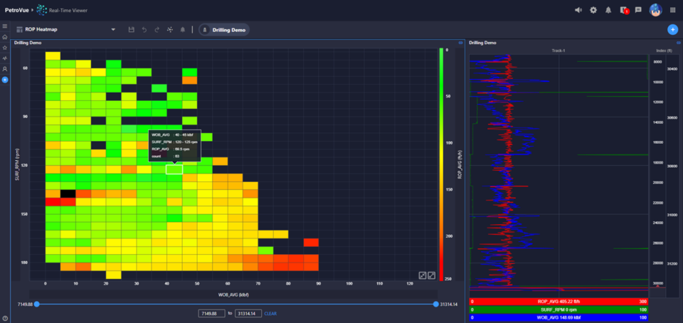 PetroVue™ Heatmaps displays were developed to meet this problem head-on. Plotting the interaction between three key variables RPM/WOB vs ROP or MSE. Colors change in real-time giving an immediate visual on whether drilling is in the sweet spot or if action needs to be taken.